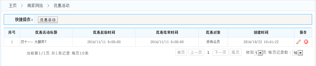 2.編輯:可以對該優(yōu)惠活動(dòng)修改屬性;可以將該優(yōu)惠活動(dòng)刪除